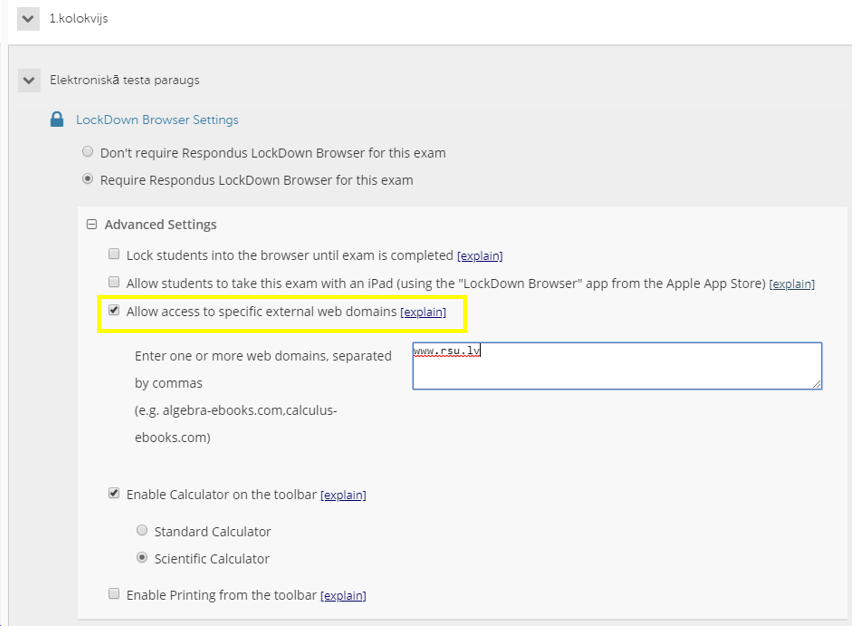 Pārbaudījums, kurš veidots ar LockDown Browser izmantošanu, aizliedz izmantot jebkādas programmas un lietotnes (arī iebūvētos kalkulatorus), taču docētājiem ir iespējams iespējot kalkulatoru. Lai iespējotu kalkulatoru, atveriet Respondus Informācijas paneli (Dashboard) Jūsu izvēlētajā kursā kā aprakstīts augstāk. Pēc tam izvēlieties Advanced Settings un ielieciet ķeksi pie Enable Calculator on the toolbar.