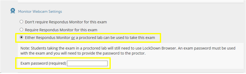 Iespējams studējošajiem dot izvēli, vai pārbaudījuma laikā izmantot tīmekļa kameru un LockDown Browser drošo pārlūku vai bez kameras ar LockDown drošo pārlūku. Šādā gadījumā nepieciešams nodrošināt paroli.
