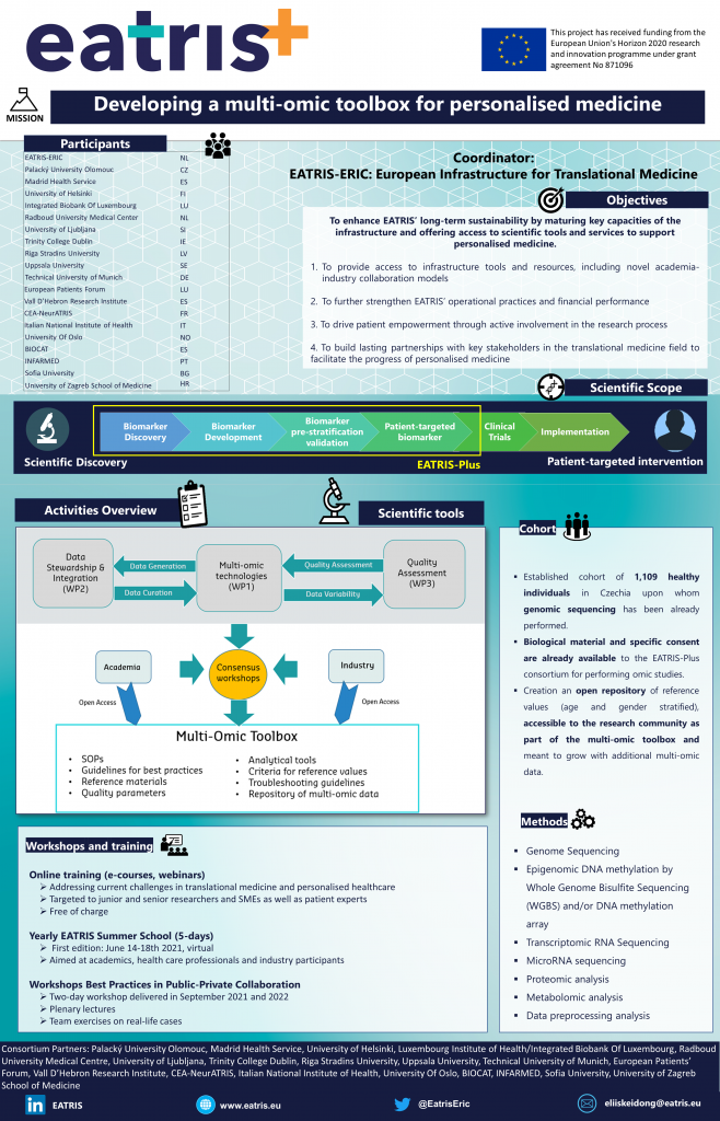EATRIS-Plus project aims to support the long-term sustainability of the European Research Infrastructure for Translational Medicine (EATRIS) by delivering innovative scientific tools to the research community, strengthening the EATRIS financial model, and reinforcing EATRIS’ leadership in the European Research Area in the field of Personalised Medicine (PM).