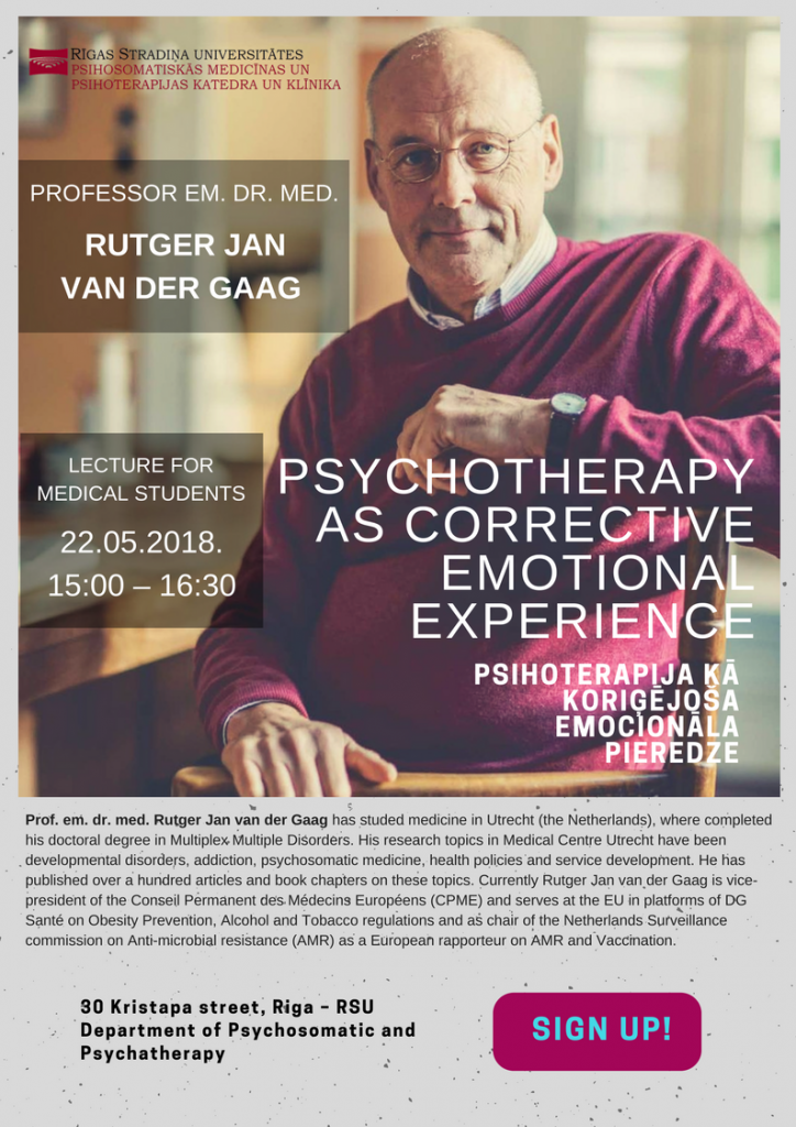 On 22 May we invite you to attend a lecture for medical students Psychotherapy as corrective emotional experience (in English) by guest lecturer Prof. em. Dr. med. Rutger Jan van der Gaag.The lecture will be held in English.ReGISTRATIONLocationRoomDepartment of Psychosomatic Medicine and PsychotherapyDate: 22.05.2018.