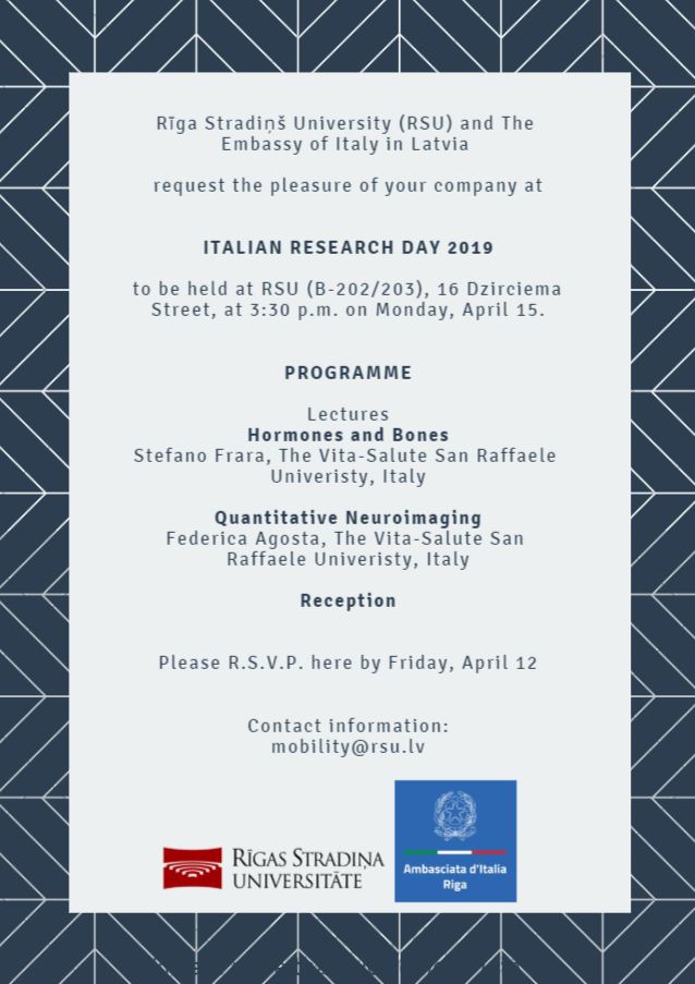 You are welcome to participate in guest lectures conducted by professors of the Vita-Salute San Raffaele University and celebrate Italian Research Day. The lectures will be followed by reception.RegistrationLocationRoomB-202Date: 15.04.2019. Contacts Erasmus+ MobilityPhone: +37167062741, +37167409264E-mail: mobility [at] rsu.lv