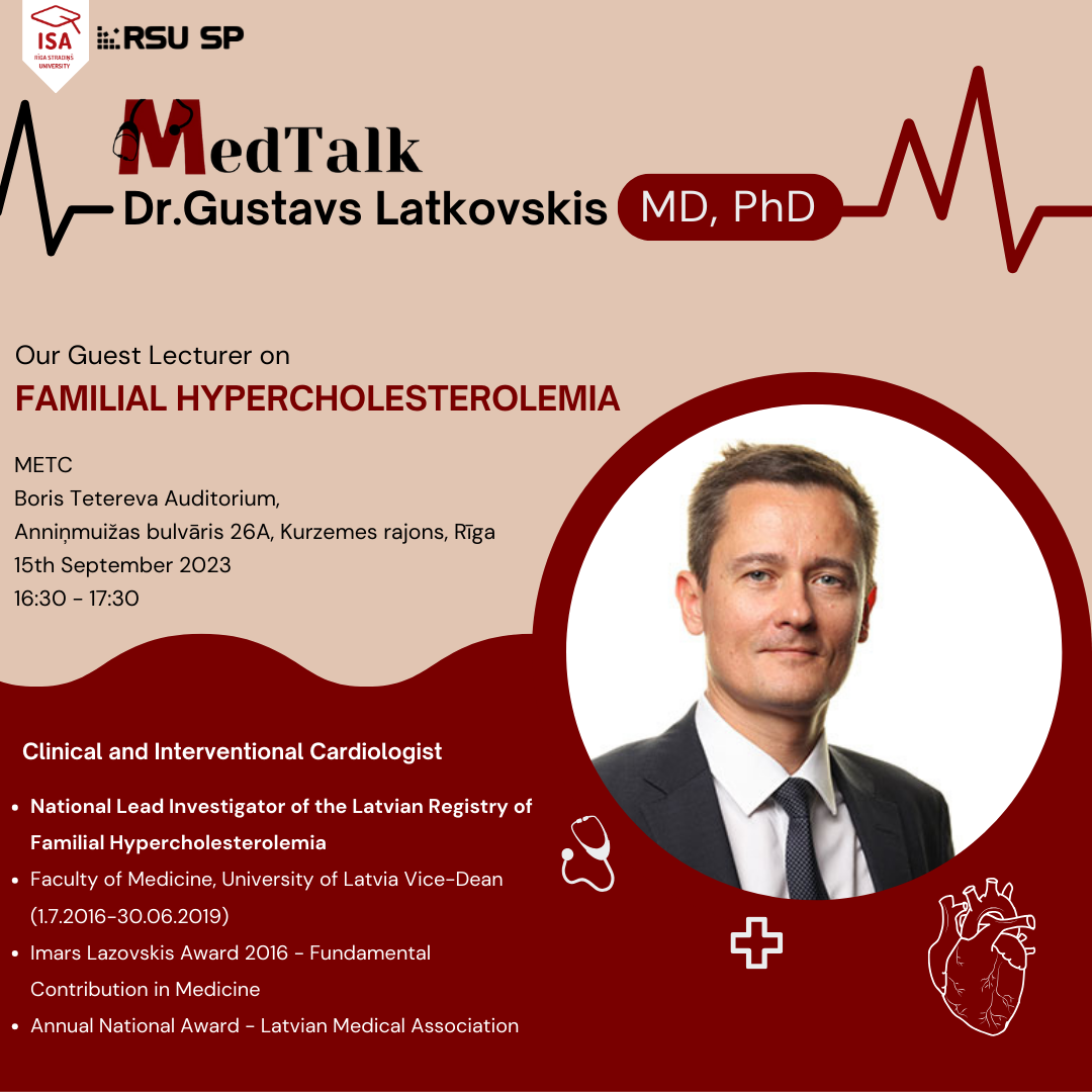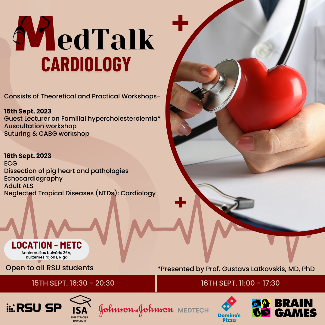 MedTalk is an annual event featuring a series of hands-on workshops and informative sessions focused on a specific medical field. This year's MedTalk will be focusing on cardiology and we have a selection of great workshops in store for as well as a guest lecture on Familial Hypercholesterolemia presented by Prof. Gustavs Latkovskis MD, PhD.