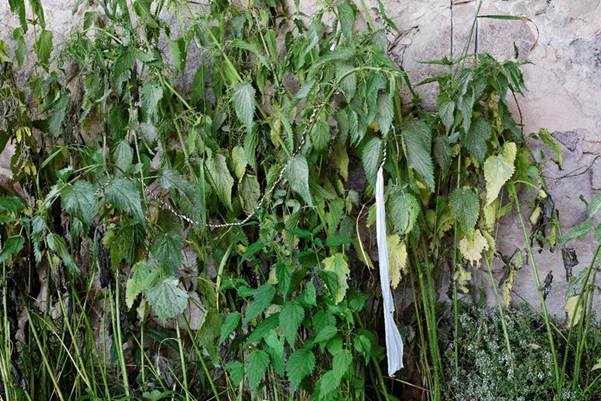 The belt displayed in the photo has been wreathed from nettles and plastic bags and is part of a performance outfit.