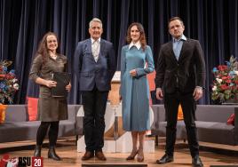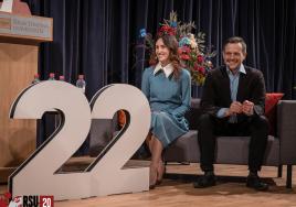 The hosts of the RSU ISC 2022 opening and closing events: Alise Elizabete Rone and Adam Bott.