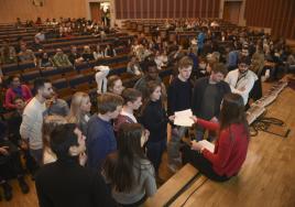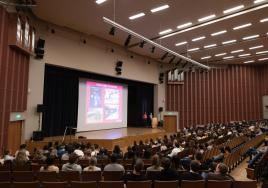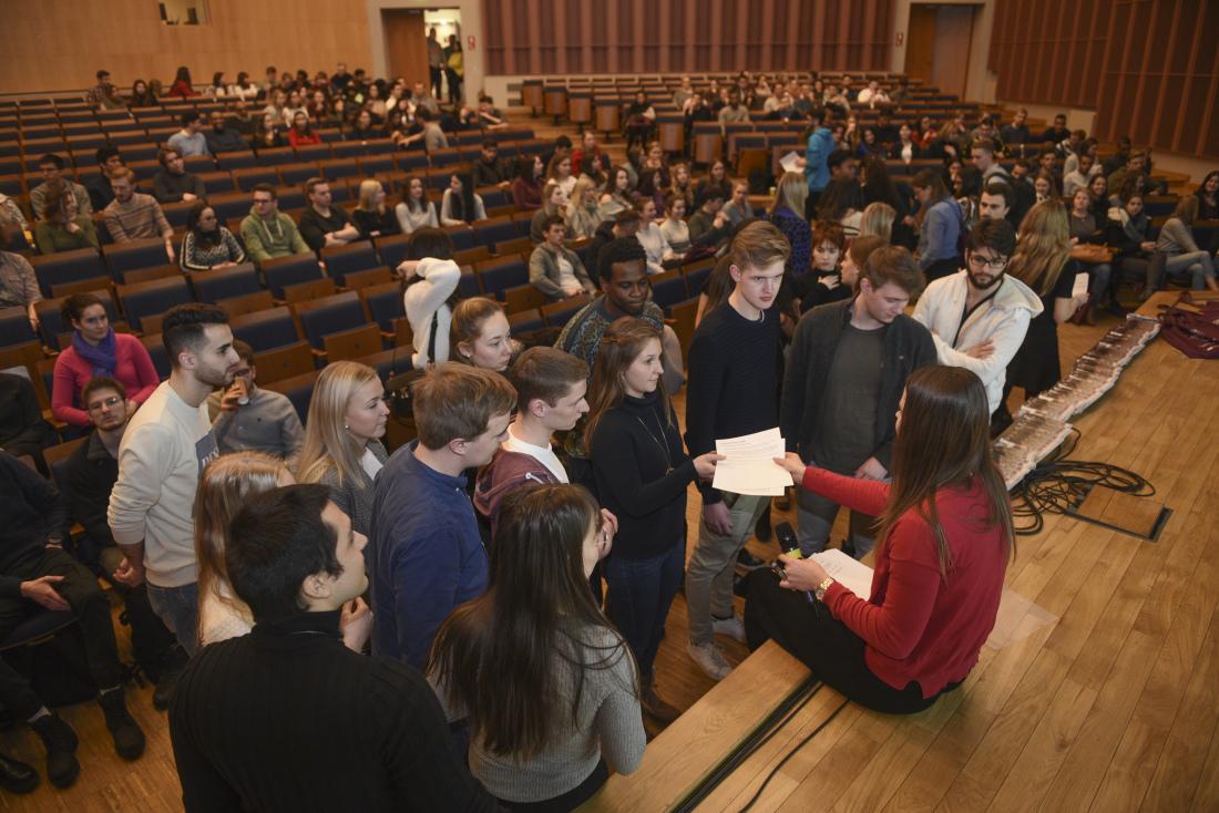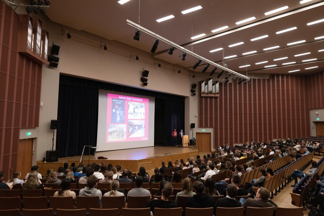 New international students in the RSU auditorium during Orientation Week.