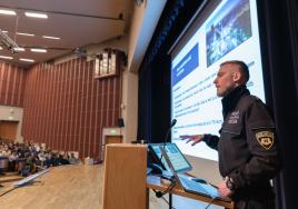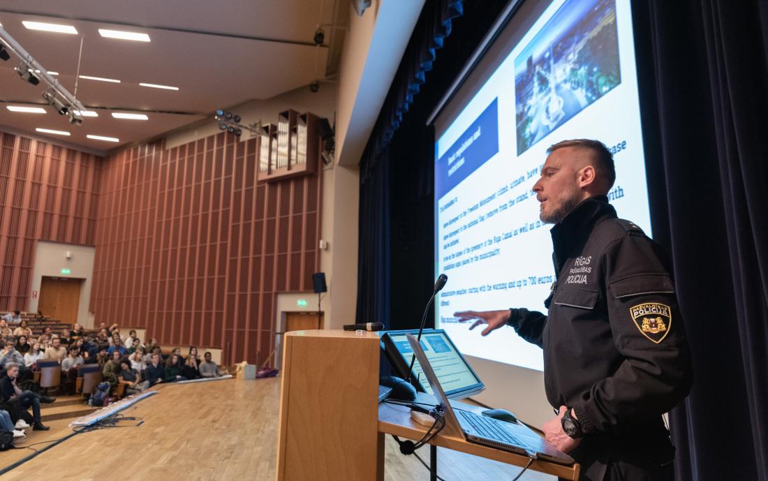 Am officer of the Municipal Police addresses the new international students during Orientation Week.