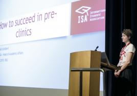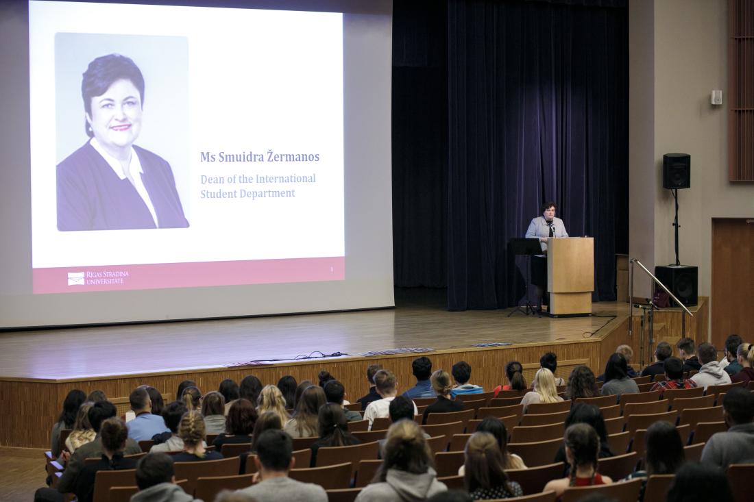 Smuidra Žermanos, Dean of the International Student Department, addresses the new international students.