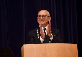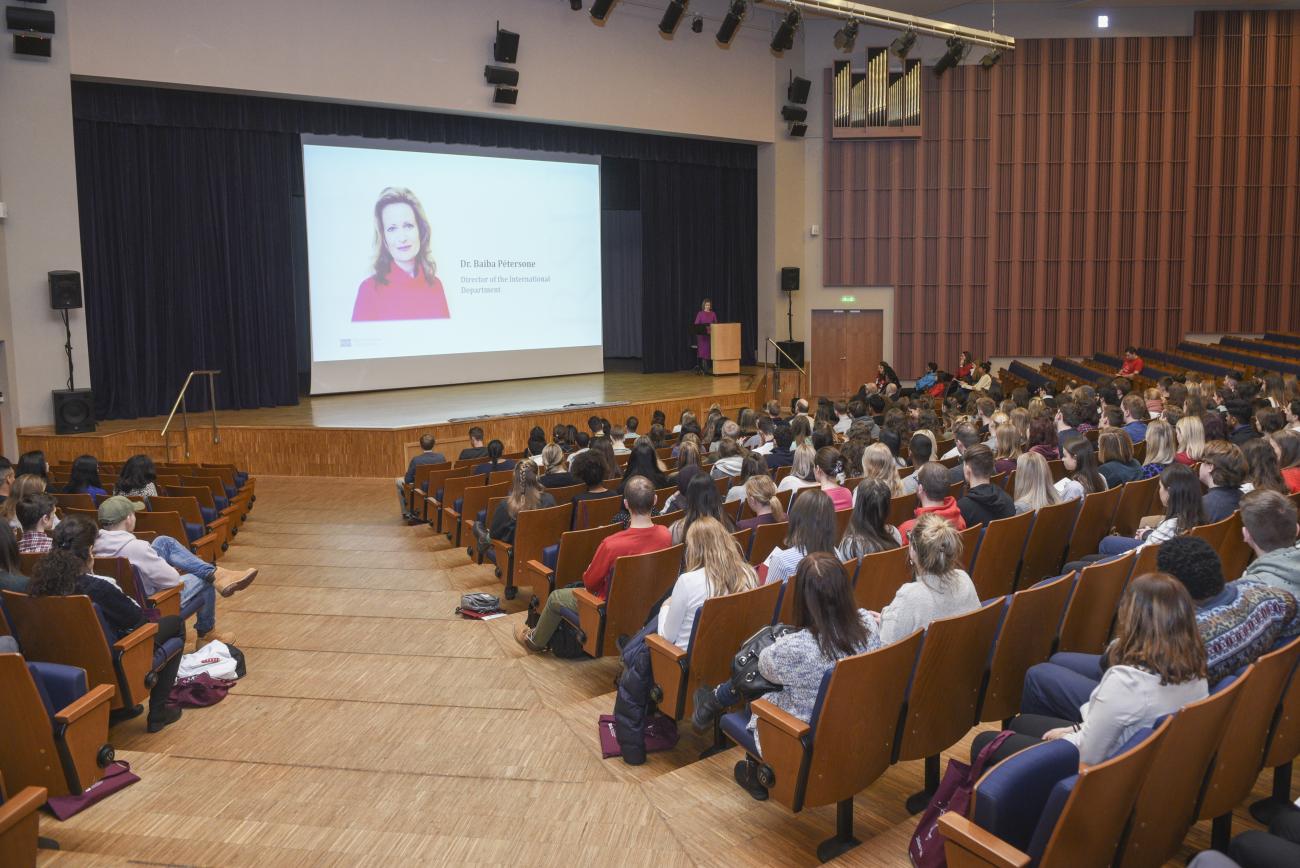 RSU Rector and Professor, Aigars Pētersons, addresses the new international students.