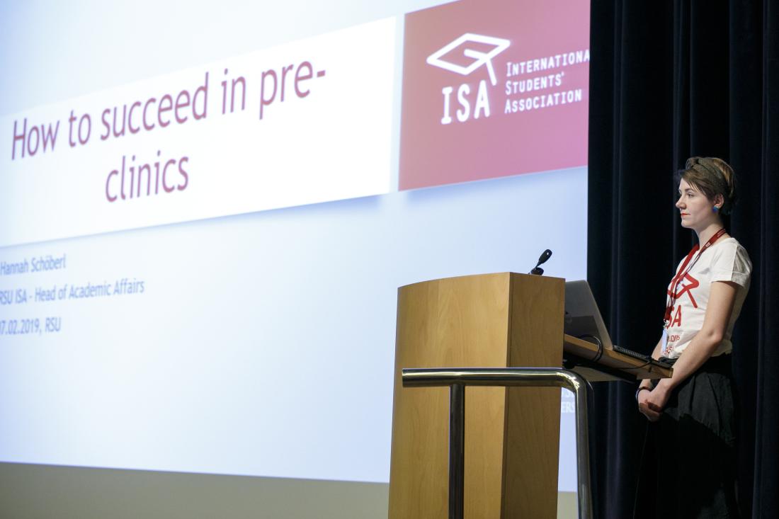 ISA representative, Hannah Schoeberl, addresses new international students in the RSU auditorium during Orientation Week.