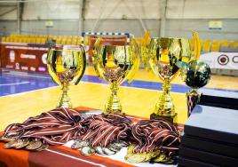 Team captain Artūrs Mhitarjans accepts the team's prizes on their behalf
