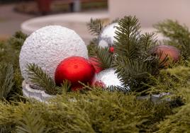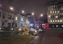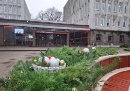 Ziemassvētku dekori pie RSU centrālās ēkas