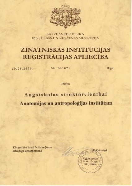 The IAA was established in late 1997 and documentation on its first activities were compiled and printed in the Institute of Anatomy and Anthropology publication of the Latvian Academy of Medicine/Rīga Stradiņš University in 2002.