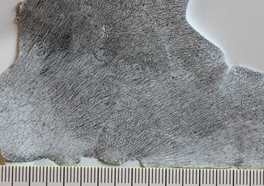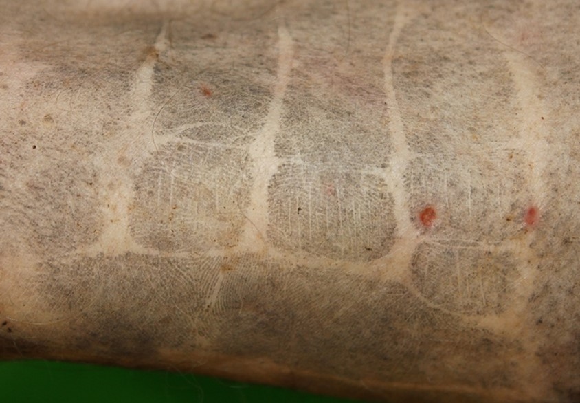 Traces of papillary line patterns visualised on the right ankle with Black Special dactyloscopic powder and copied on White silicone with paste hardener. Image from Aelita Zīle’s doctoral thesis