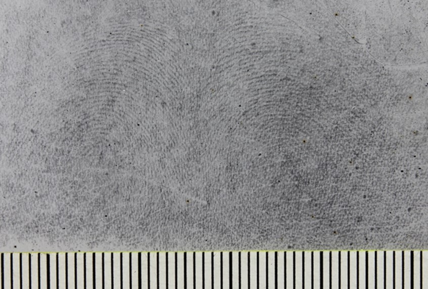 A trace of a papillary line pattern on the forearm of the right hand, made visible by using Swedish Black fine consistency fingerprint powder. Image from Aelita Zīle’s doctoral thesis