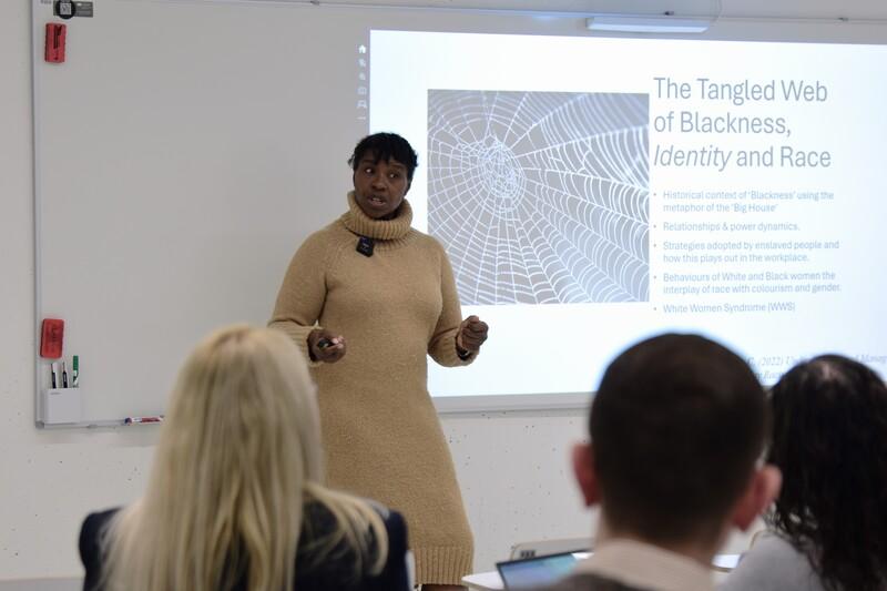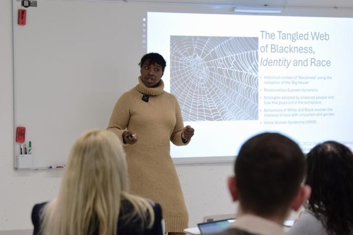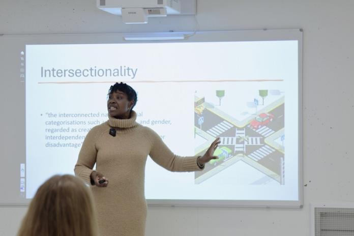 I work like a jigsaw. I start small so people feel comfortable in their own space. I gave a short lecture – about an hour – to position race, gender, and class as pillars of intersectionality, then moved into a workshop. I’d asked people to do some pre–thinking, for example, reflecting on the “single story” idea – and to bring something that reminded them of intersectionality. I wanted them to reflect, to challenge themselves, and to understand their own identity.