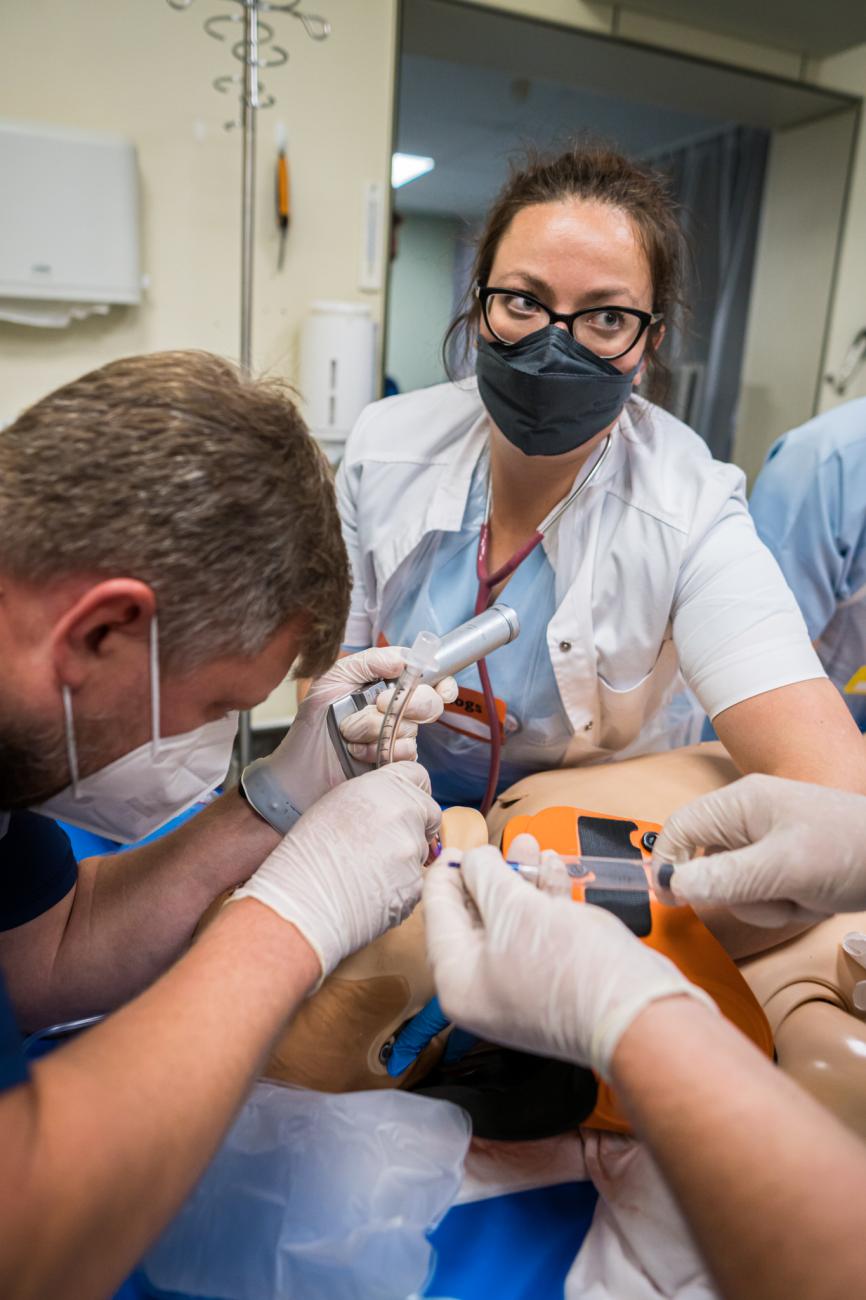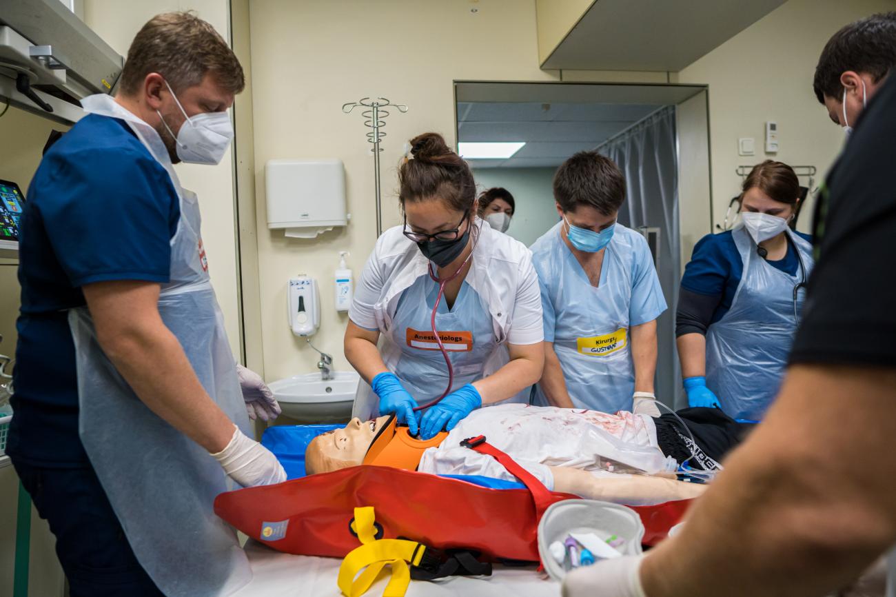 During SimWeek, two large-scale in situ simulations involving multiple injuries were organised at the university hospitals, during which medical teams from admission units had to plan the resources they would need, examine the patients, and provide the necessary assistance. Both simulated patients and high-quality mannequins, on which various invasive manipulations can be performed, took on the role of the injured patients. In situ simulation means that the simulation scenario is played out in the actual working environment rather than in a specially designed training room, in this way it is possible to evaluate not only the participants’ skills and cooperation, but also the suitability and availability of the hospital premises and equipment, improving them if necessary.