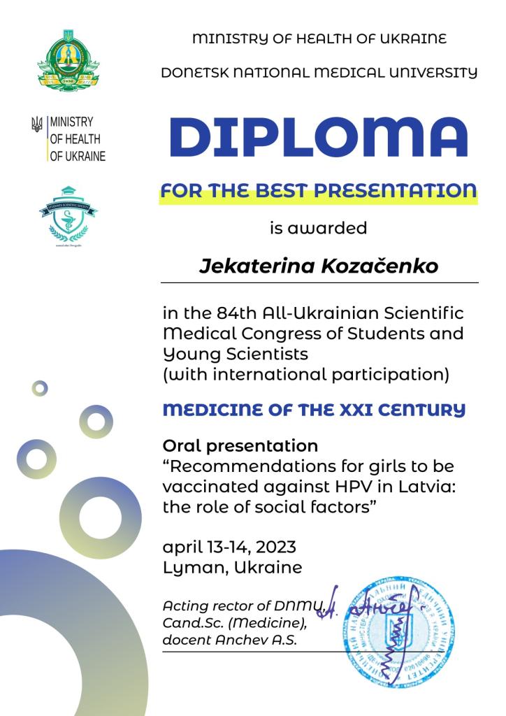 Students and young researchers from all over the world were invited to participate in the congress to share their research in 15 healthcare-related sections. Kozačenko’s abstract “Recommendations for Girls to Be Vaccinated Against HPV in Latvia: The Role of Social Factors” was selected for oral presentation in the Epidemiology, Infectious Diseases and Laboratory Diagnostics section.
