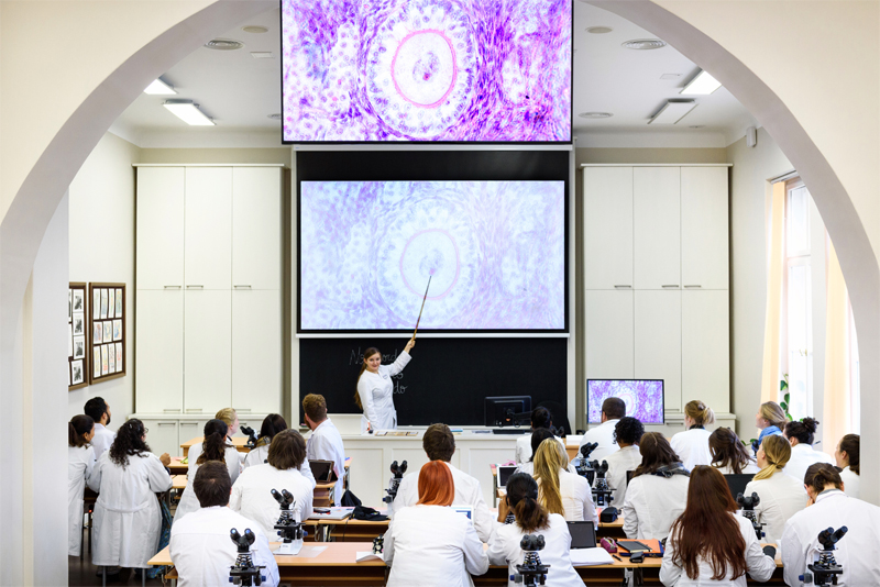 Lecturer Zane Vitenberga-Verza conducting a class at the RSU Anatomical Theatre.