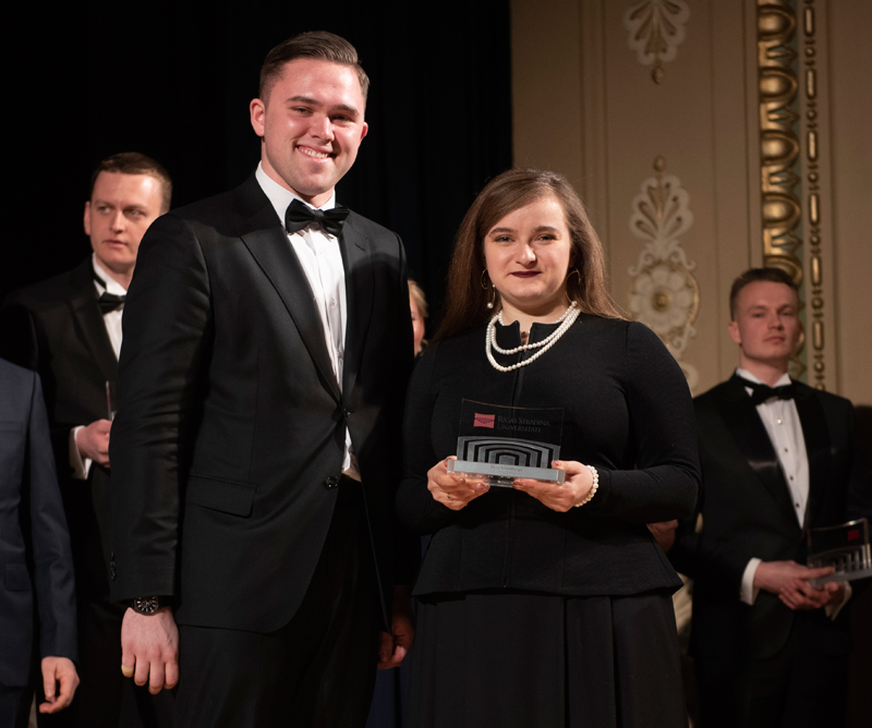 The President of RSU Student Union Māris Lapšovs and lecturer Zane Vitenberga-Verza after receiving the RSU Award of the Year 2019 at the Riga Latvian Society House on 6 April.
