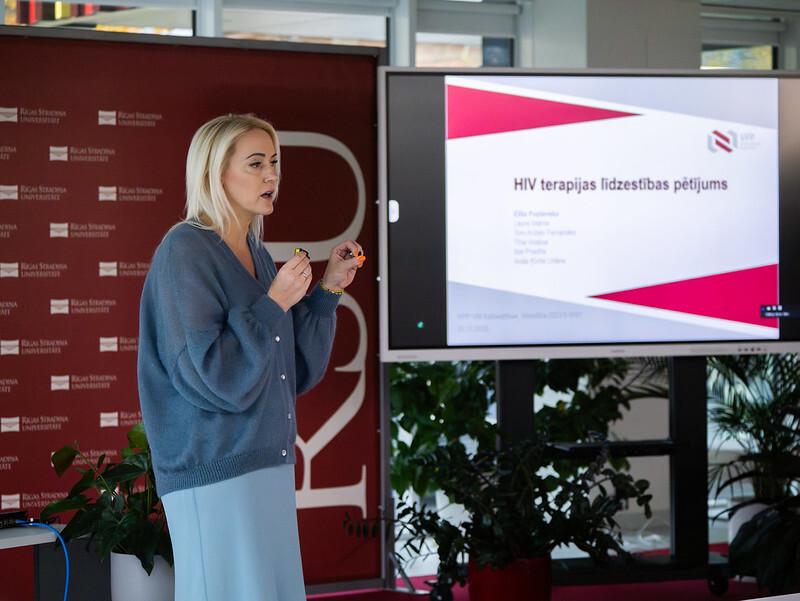 Assoc. Prof. Elita Poplavska presented the HIV medication adherence study, which revealed that 70.7% of respondents occasionally forgot to take their medication, while 31% did not follow the prescribed usage guidelines.