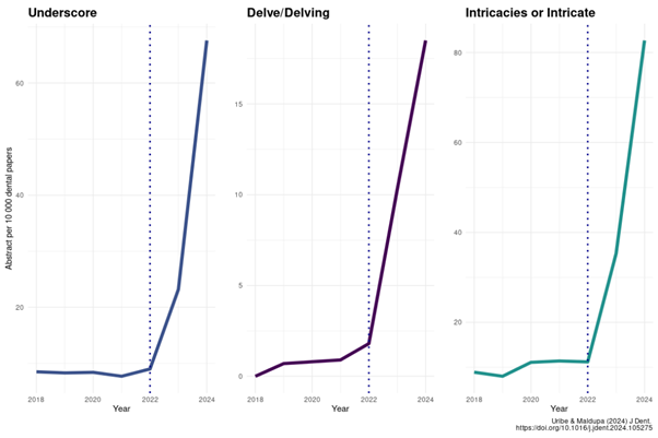 The study, led by Assoc. Prof. Sergio Uribe and Dr. Ilze Maldupa, analysed nearly 300,000 dental research abstracts published between 2018 and 2024. Using a bibliometric approach, the researchers identified specific signal words commonly associated with content generated by ChatGPT. The results showed that nearly 10 out of every 100 papers contain these specific words, indicating a significant presence of AI-assisted writing in dental research. Some of these words are shown here. The dotted line marks the date that ChatGPT was released.