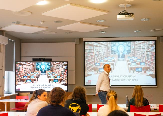 The first lecture by Head of the RSU IT Service Centre Jānis Laizāns, was titled “Collaboration and AI Exploration with MS 0365”. Laizāns skilfully mixed informative content with an engaging, friendly demeanour that elicited genuine laughter from the participants. During the lecture, he covered ethical questions concerning the use of AI to come up with topics for research, structure presentations, improve written assignments, and check work for plagiarism. Furthermore, Laizāns informed students about the free programmes and tools available at RSU and showed students how to use them. These include document collaboration tools and different functions of Microsoft, like MS Teams and OneDrive.