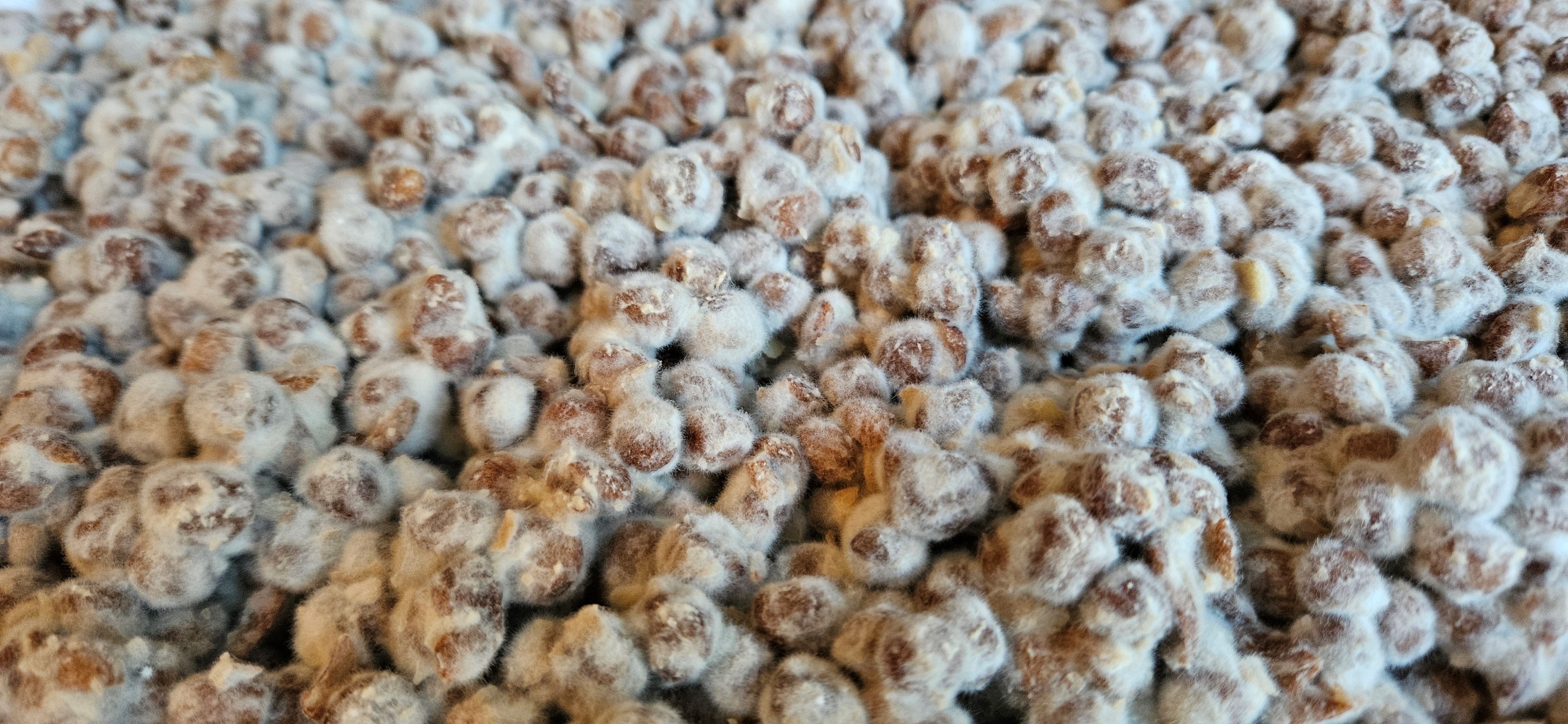 Inoculated grey peas start the first phase of fermentation. The mycelium of the fungus breaks down starch and proteins.