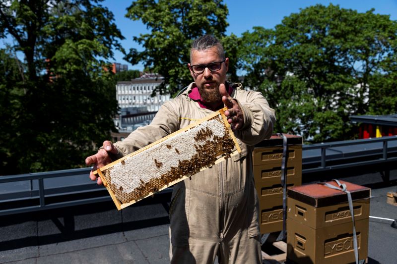 From time to time, people come out on to the roof and inquire about the bees and beekeeper Krievkalns is happy to answer. We leave the roof to continue a more personal conversation.