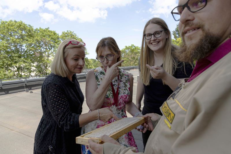 Later, the building's hosts – Prof. Dace Bandere, Dean of the RSU Faculty of Pharmacy, Asst. Prof. Agnese Brangule, Lead Researcher at the Department of Pharmaceutical Chemistry, and Ance Bārzdiņa, Acting Assistant at the Department of Pharmaceutical Chemistry, join us on the roof. We talk about bees, honey and, encouraged by the beekeeper, enjoy fresh honey straight from the frame. Delicious!