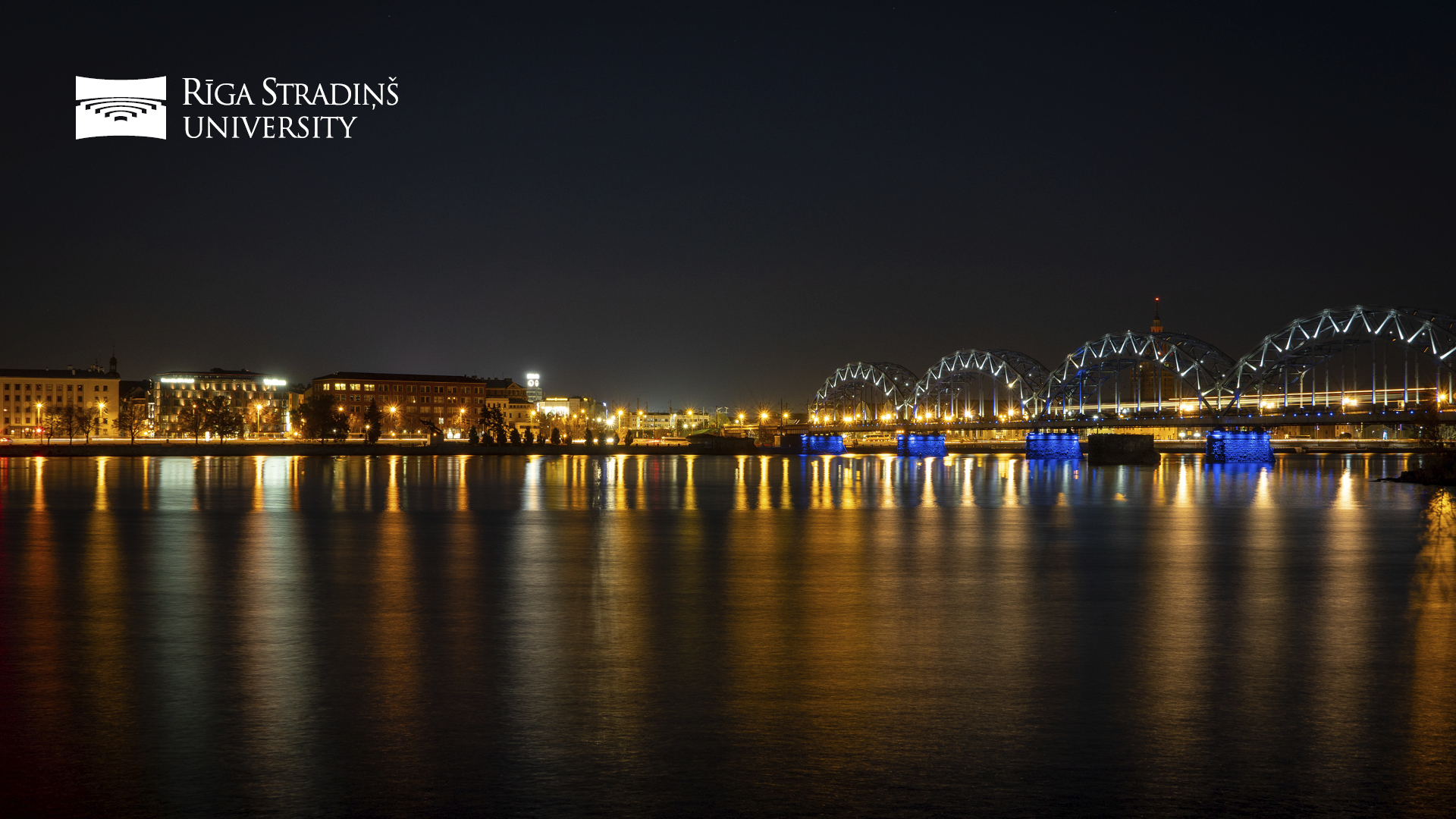 RSU 75th anniversary background. Grey with small white logos and large RSU on right hand side. Language: Latvian. Size: 1920x1080px