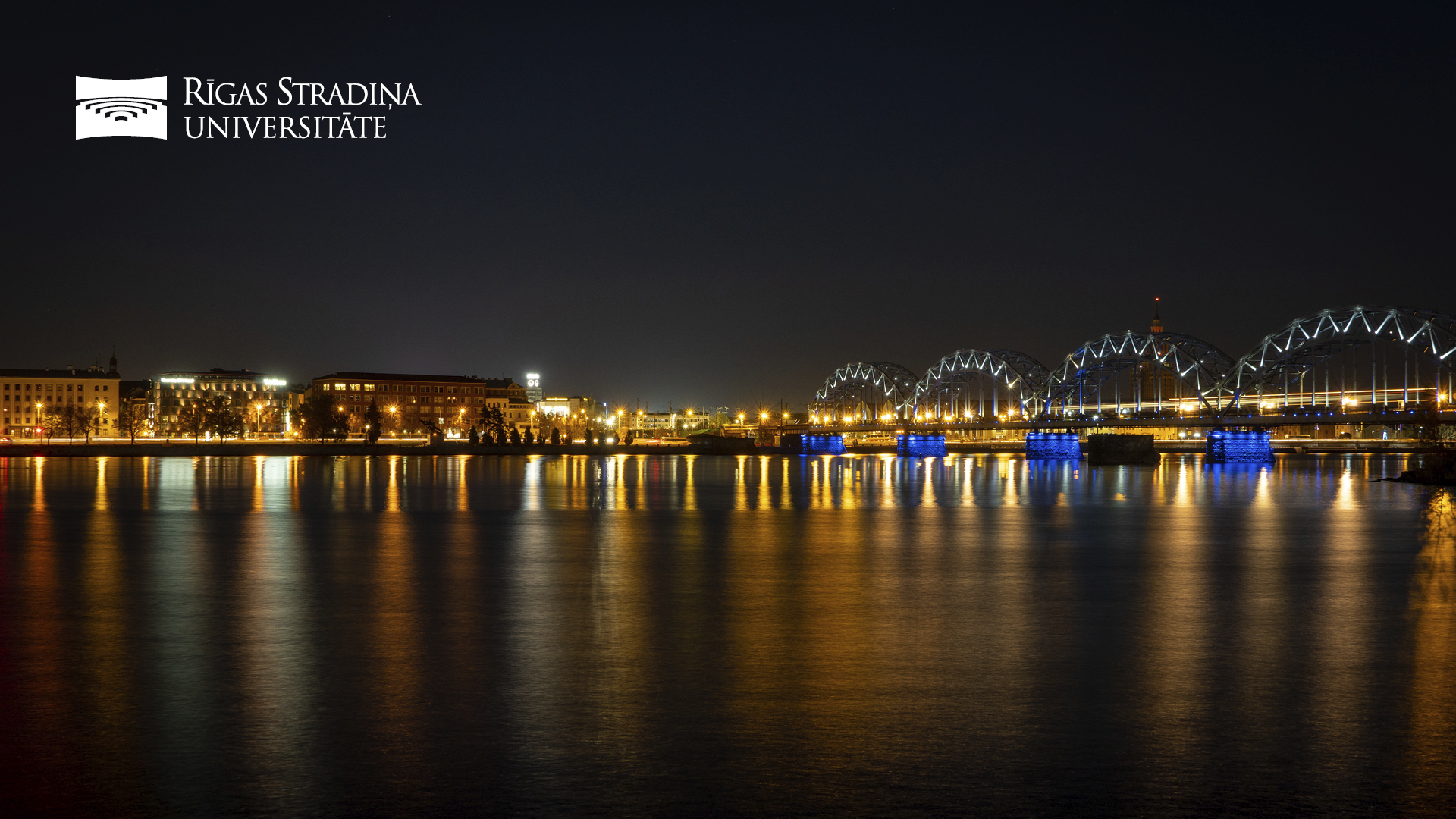 RSU 75th anniversary background. Grey with small white logos. Language: Latvian. Size: 1920x1080px