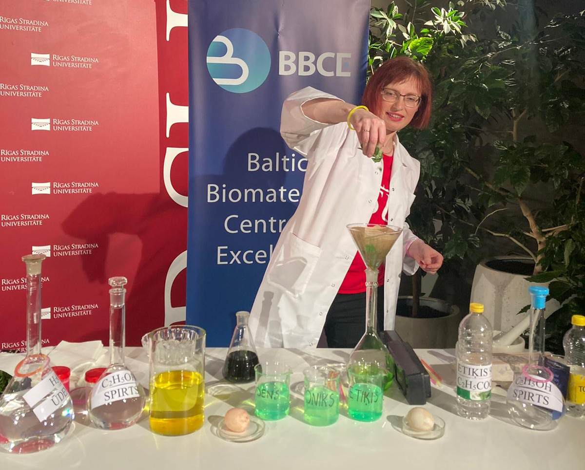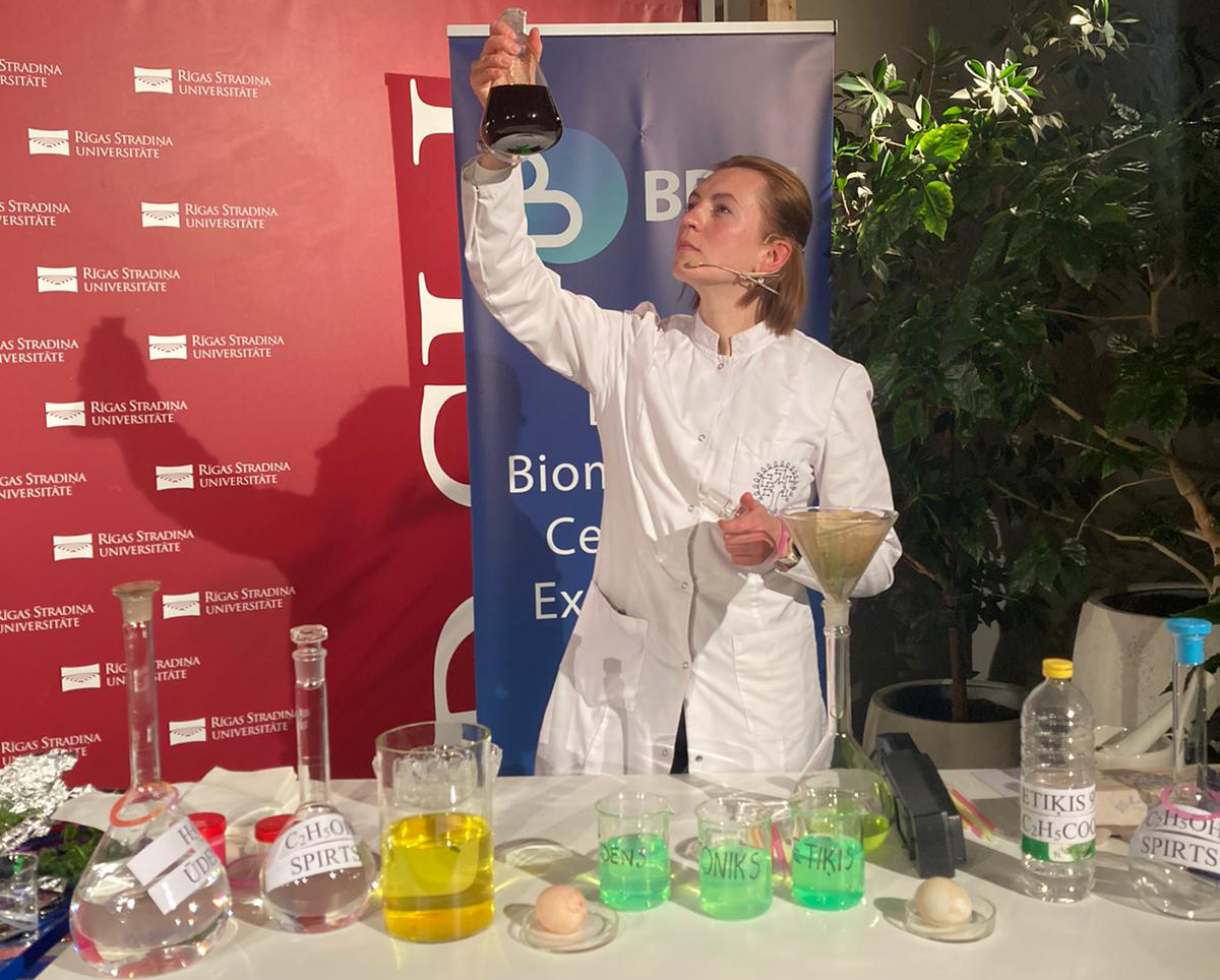 Dr Agnese Brangule, leading researcher at the RSU Department of Pharmaceutical Chemistry, and scientists from the Baltic Biomaterials Centre of Excellence participated with a demonstration Spīdolas implanti jeb četri mājās atkārtojami luminiscējoši eksperimenti (Spīdola’s implants – four glow-in-the-dark experiments you can do at home).