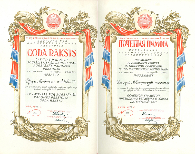 Letter of commendation from the Presidium of the Supreme Council of the Latvian SSR, 1975.