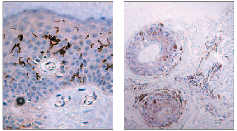 Figure 4. Concentration of CD1a+ cells around apoptotic keratinocytes (left) (× 400, Dako), mild inflammatory reaction and CD1a+ cells around appendages (right) (× 100, Dako)
