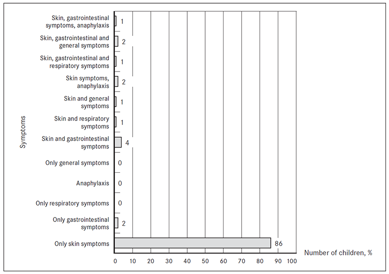 Symptoms. The most common complaints were skin symptoms (98 %, n = 98) and gastrointestinal (GI) problems (10 %, n = 10). Anaphylactic reactions were observed in 3 % (n = 3), respiratory symptoms in 2 % (n = 2), general symptoms (growth failure, irritability) in 3 % (n = 3). 12 % (n = 12) of patients had symptoms from more than one organ system. Only two patients had isolated GI symptoms. None of the patients had respiratory symptoms as the only complaint (Figure 3).