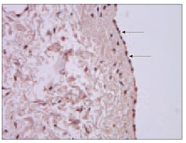 Figure 6. Moderate nucleus of VEGF immunoreactive cells in endocardial layer (arrows, patient No. 4, IMH, × 200) | Figure 7. Chromogranin A containing epicardium (arrows, patient No. 3, IMH, × 400) |