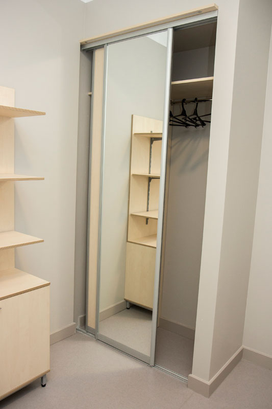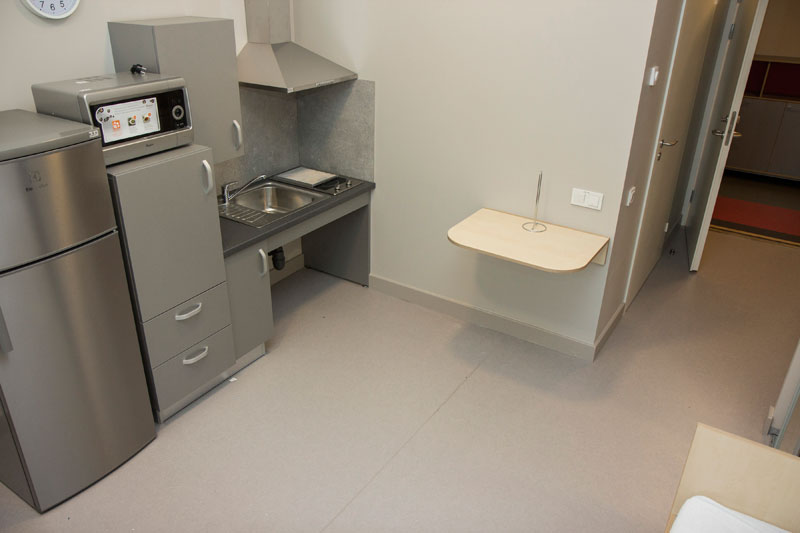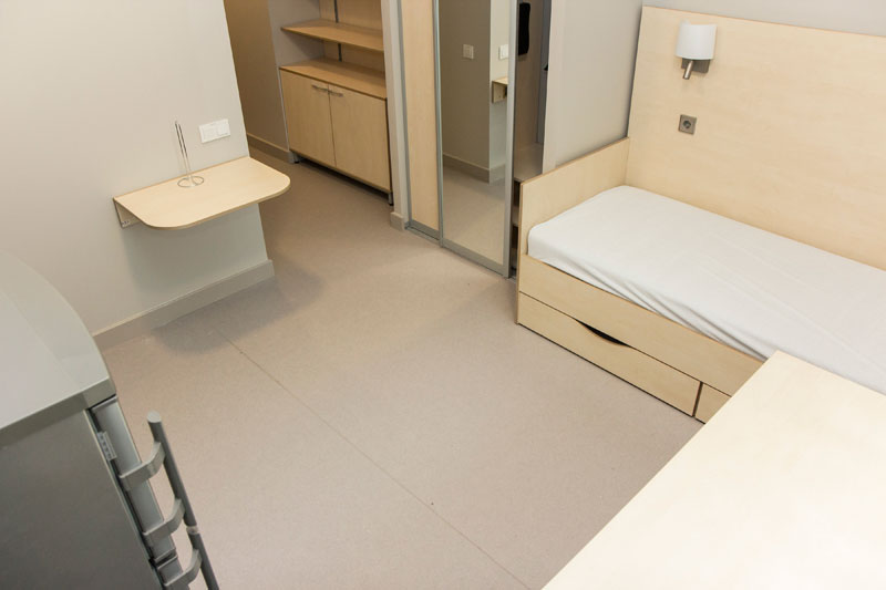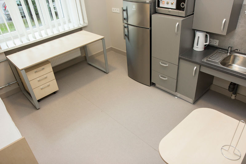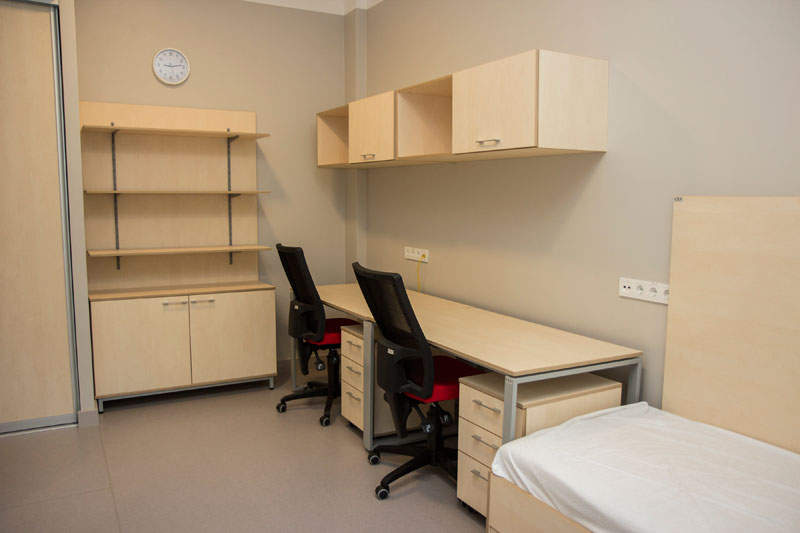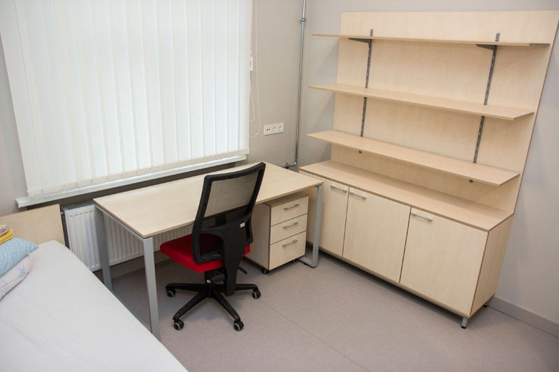 Each room has a bed with a pillow, blanket, bed sheets, desk, chair, shelf and a closet. Please note that students have to provide their own kitchenware (utensils, pans, pots, etc.).