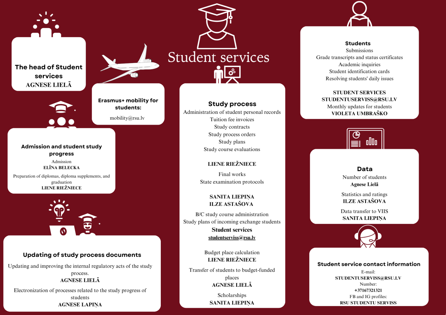 Rīga Stradiņš University (RSU) Student Services is a structural unit committed to assisting current and prospective students in both their academic- and everyday needs. Student Services can give advice on the study process and provide general information about other structural units, like their location and contact information. Students seeking information can do so in person, by phone, or via email.