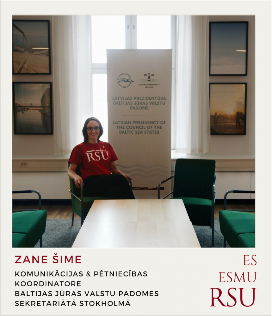 | Zane Šime 2011. gadā absolvējusi žurnālistikas programmu, iegūstot bakalaura grādu komunikācijas zinātnē.Šobrīd strādā Baltijas jūras valstu padomes sekretariātā Stokholmā ar zinātnes, pētniecības un inovāciju sadarbības projektiem kā komunikācijas un pētniecības koordinatore. |