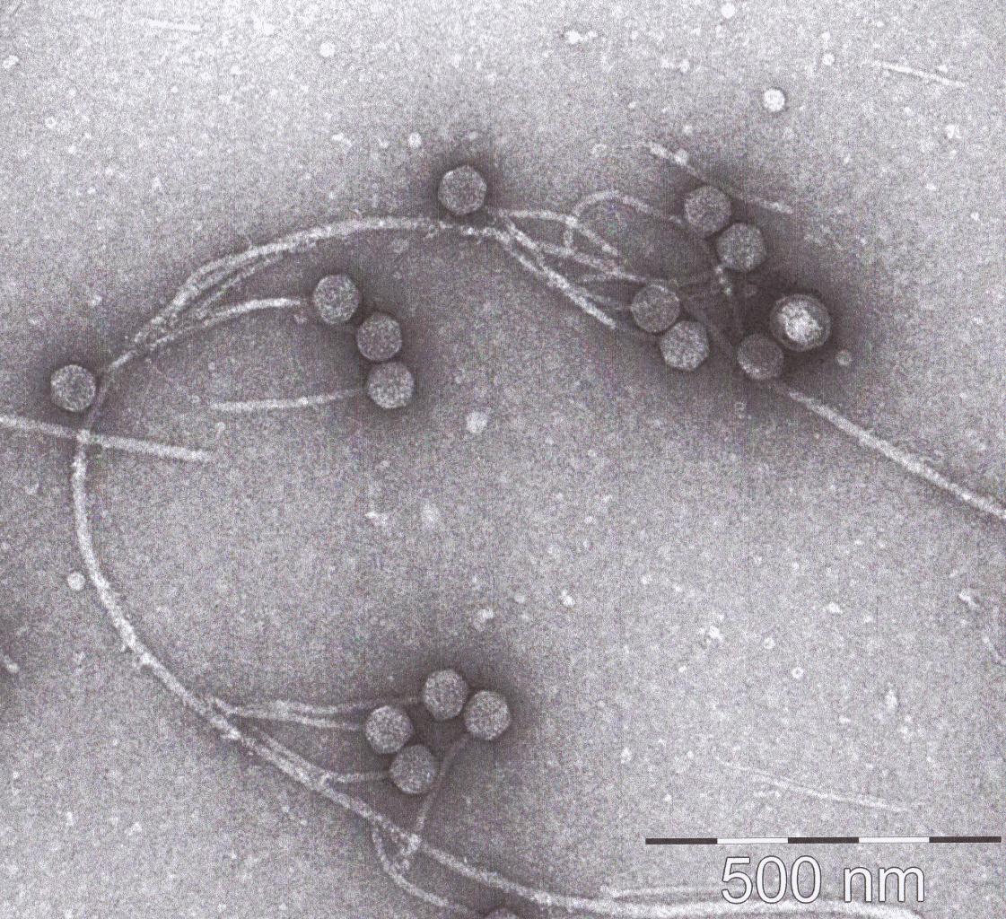 Attēlā redzams Siphovirus caurstarojošā elektronimikroskopijā