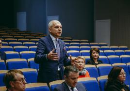 RSU Padomnieku konventa loceklis Māris Rēvalds ar kolēģiem sēdes laikā Borisa Tetereva auditorijā, Medicīnas izglītības tehnoloģiju centrā
