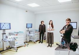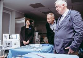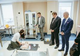 RSU Padomnieku konventa locekļi Sandra Kaija, Māris Rēvalds (centrā) un Juris Lācis apskata Medicīnas izglītības tehnoloģiju centru
