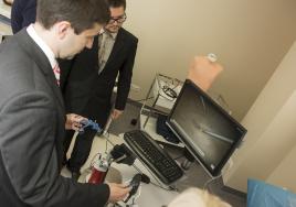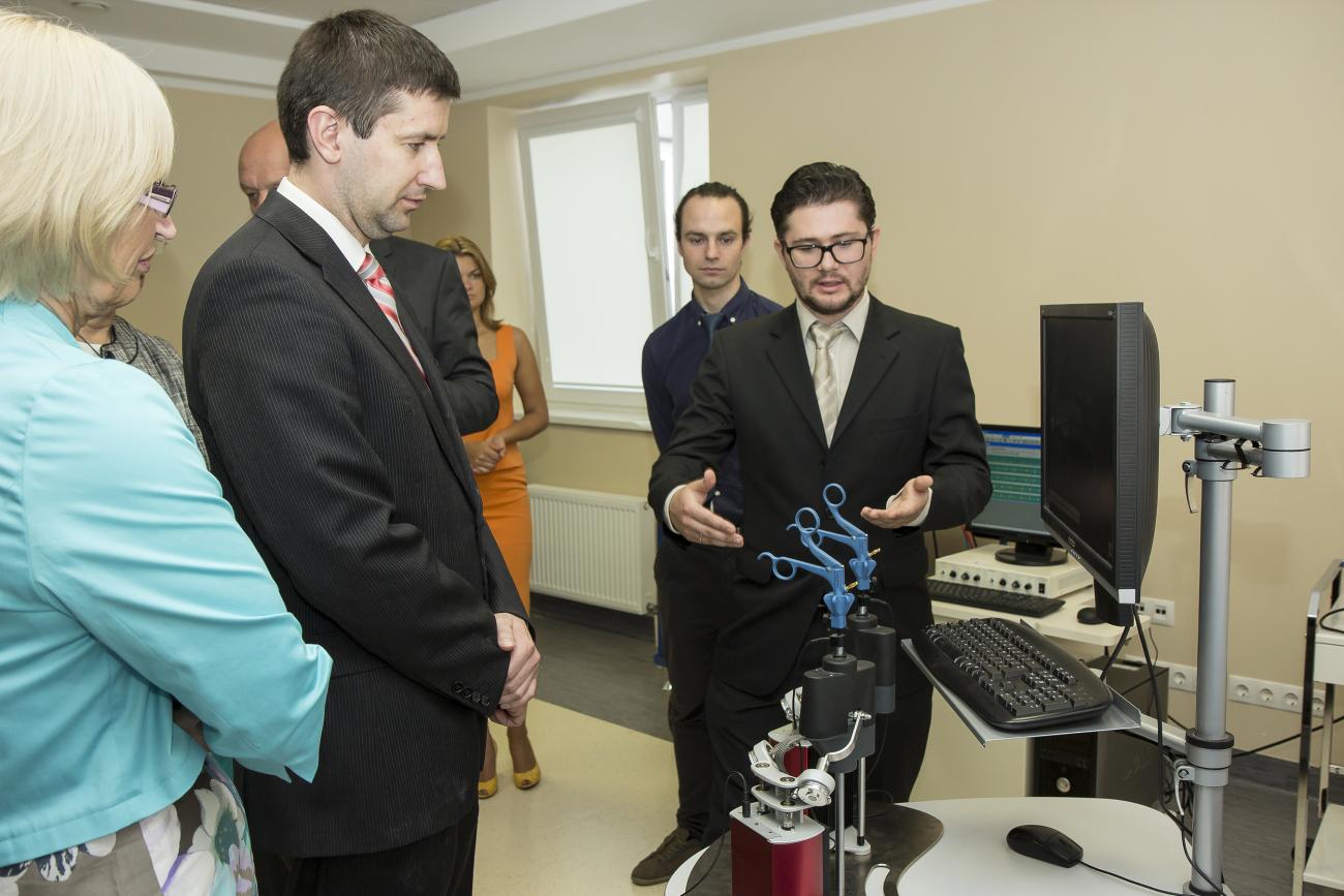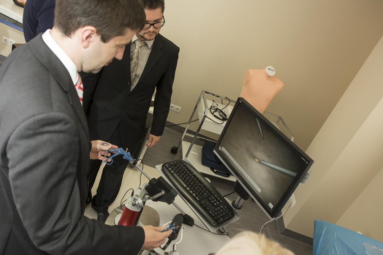 Medicīnas izglītības tehnoloģiju centra darbinieki izrāda viesiem mūsdienīgās iekārtas