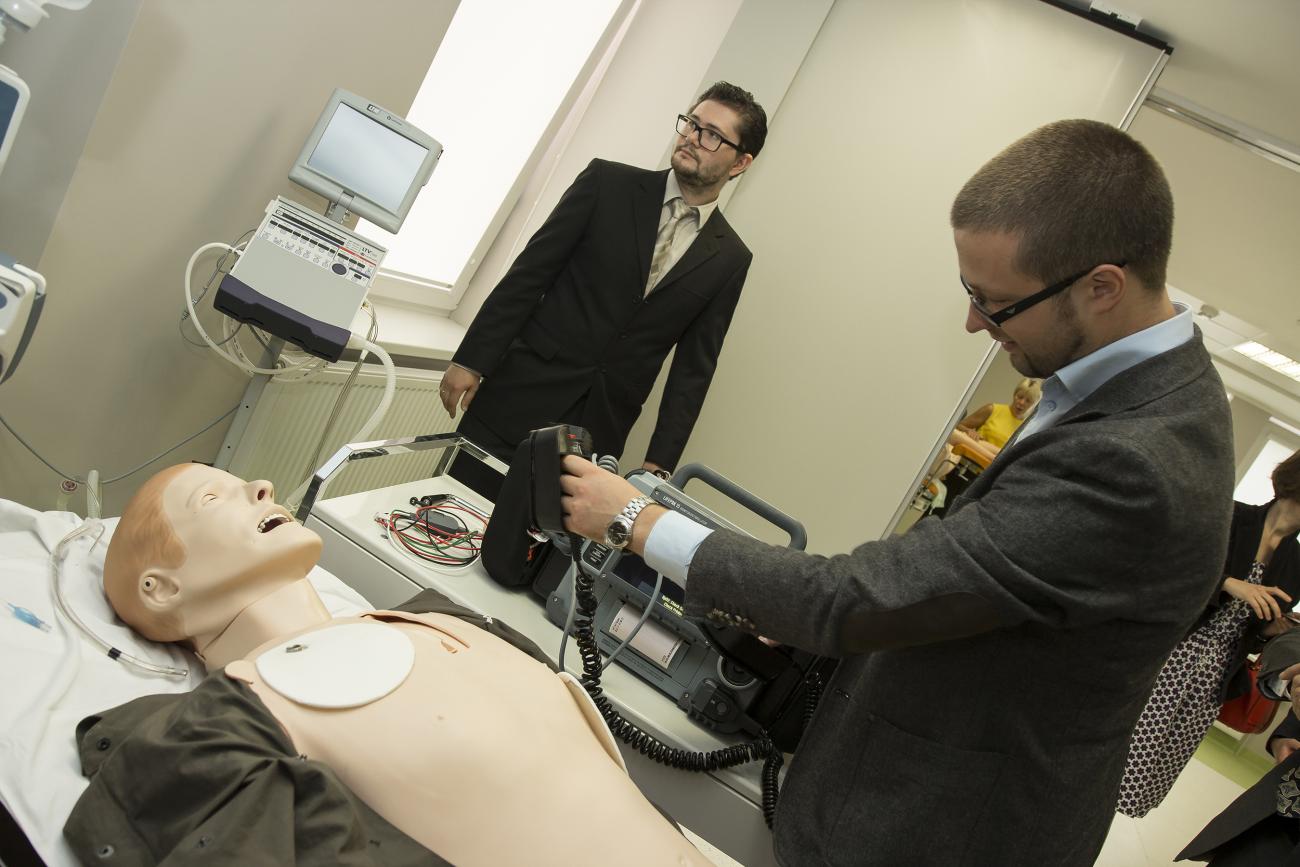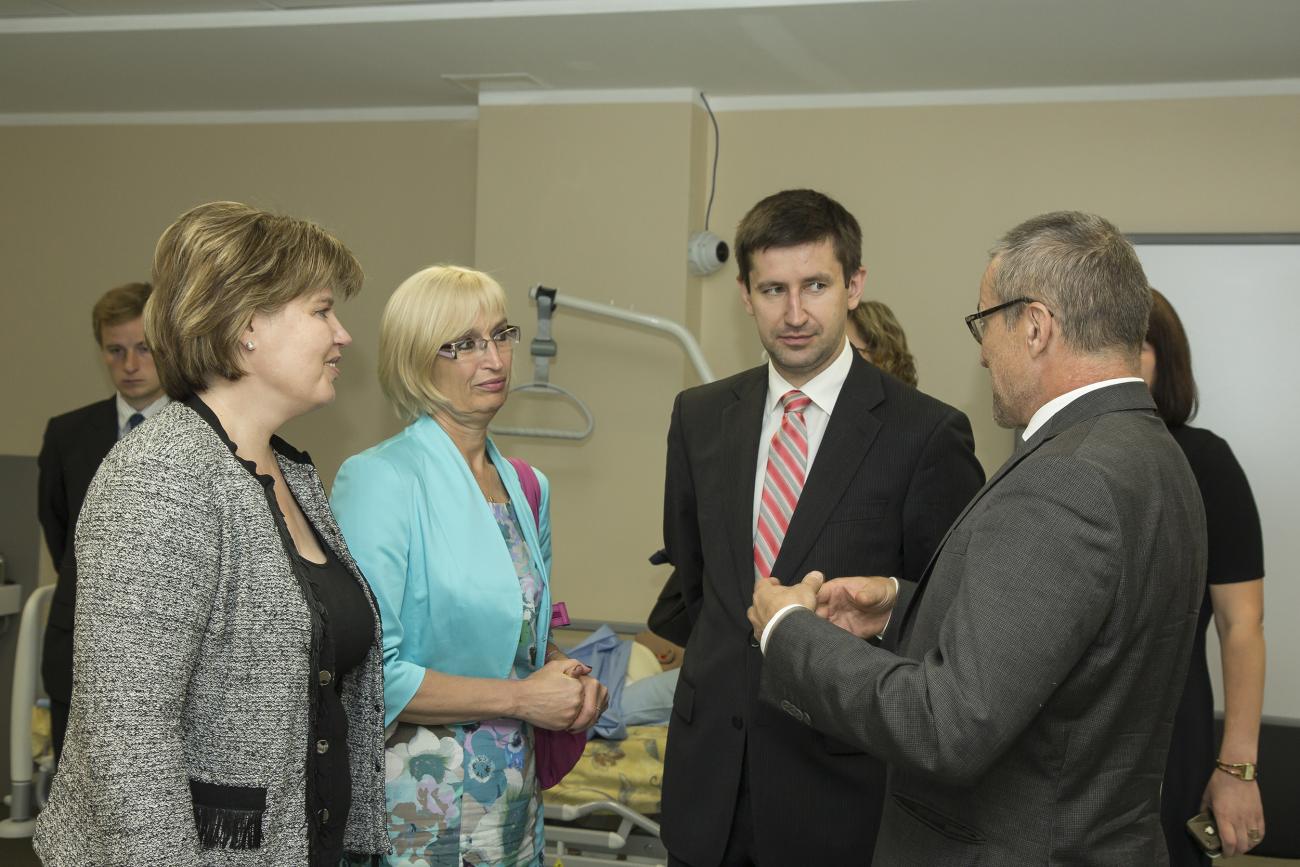 Izglītības un zinātnes ministrs Vjačeslavs Dombrovskis (no labās) vizītes laikā Medicīnas izglītības tehnoloģiju centrā