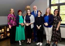 Asoc. prof. Nora Jansone-Ratinika (no kreisās), prof. Sūzija Skofīlda, prof. Elija Hotersola, prof. Aigars Pētersons, doc. Ieva Lībiete, dr. Džoana Slouna un Zane Zaharevska pēc memoranda parakstīšanas RSU Anatomijas muzejā