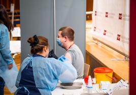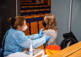 Rīgas Stradiņa universitātes studējošo un darbinieku balsvakcinācija pret COVID-19 RSU aulā 2022. gada 7. janvārī.