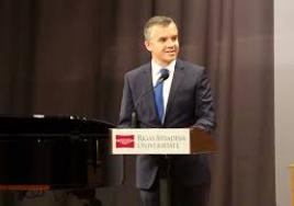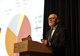 RSU rektors profesors Aigars Pētersons uzrunā Akadēmiskās sanāksmes dalībniekus