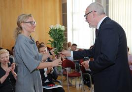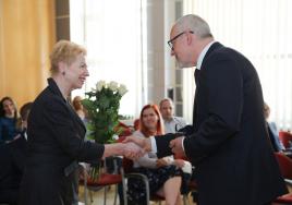 Jauno docētāju skolas atklāšana. RSU rektors prof. Aigars Pētersons sveic studiju prorektori prof. Tatjanu Koķi