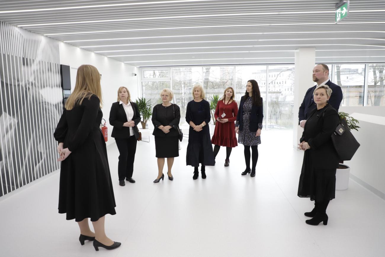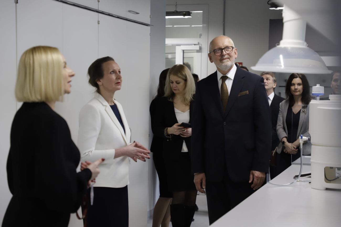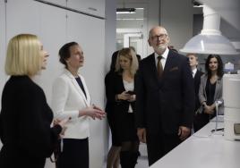 RSU rektors prof. Aigars Pētersons un Farmācijas fakultātes dekāne prof. Dace Bandere (no kreisās) izrāda veselības ministrei Līgai Meņģelsonei un viesiem Farmācijas studiju un pētniecības centra telpas