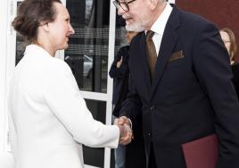 Rektors prof. Aigars Pētersons sagaida veselības ministri Līgu Meņģelsoni ierodamies Farmācijas studiju un pētniecības centra atklāšanas pasākumā